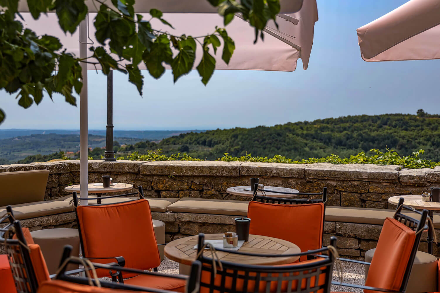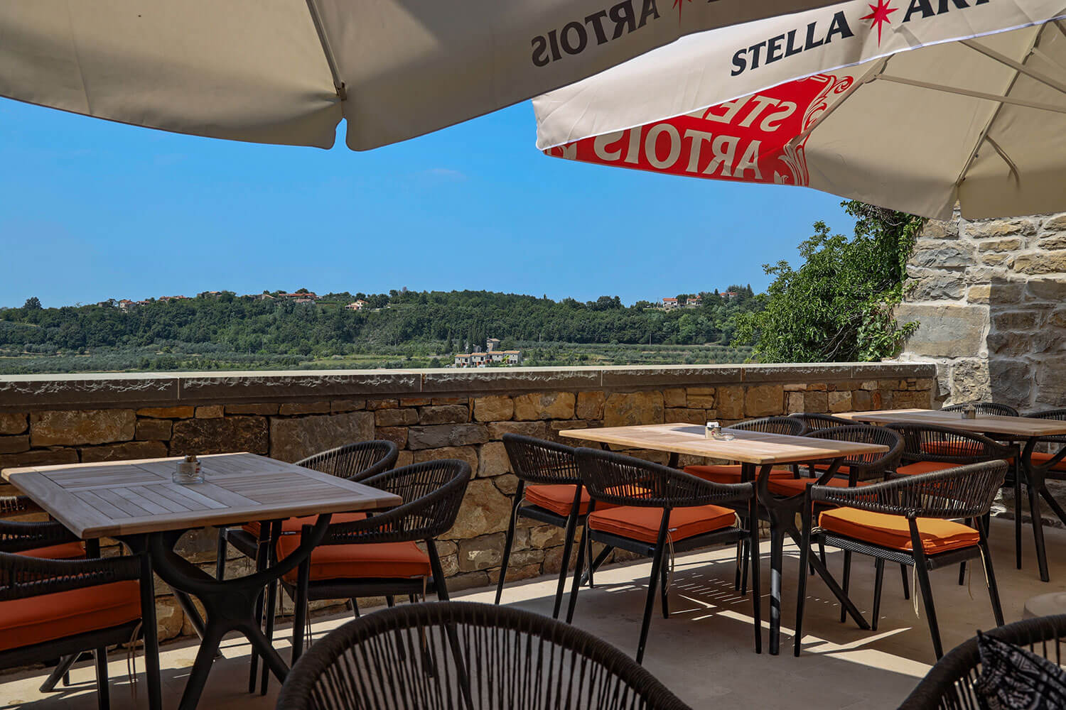 Our spacious terrace, set beneath the historic town walls and surrounded by centuries-old trees, overlooks the rolling hills, vineyards, and olive groves of the Istrian countryside. It is widely regarded as one of the best terrace views in Grožnjan.